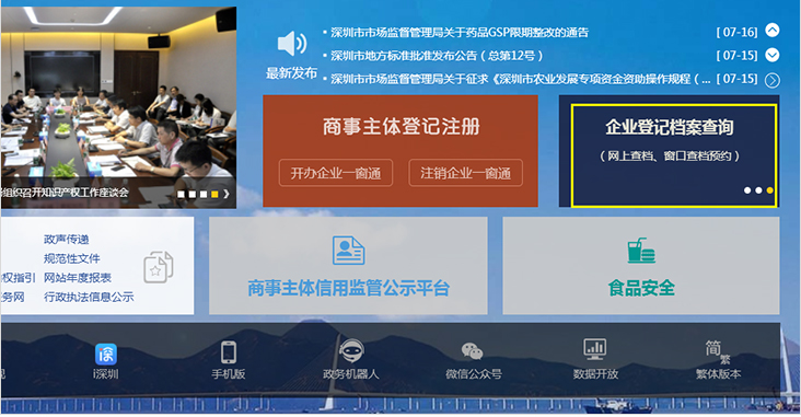 第一步:進(jìn)入深圳市市場監(jiān)督管理局官網(wǎng)http://amr.sz.gov.cn/,點(diǎn)擊網(wǎng)站主頁的商事主體登記注冊界面的“開辦企業(yè)一窗通”。