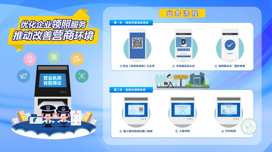 第九步:審批通過后,經(jīng)辦人將會收到短信通知,如需領(lǐng)取營業(yè)執(zhí)照,有三種渠道辦理:一是在設(shè)立 登記時申請郵政寄遞服務(wù),二是通過設(shè)置于試點(diǎn)行政服務(wù)大廳或試點(diǎn)銀行網(wǎng)點(diǎn)的24小時自助 打照機(jī)辦理,三是經(jīng)辦人或法定代表人憑身份證原件可以就近到各區(qū)行政服務(wù)大廳窗口領(lǐng)取, 支持全城通辦。