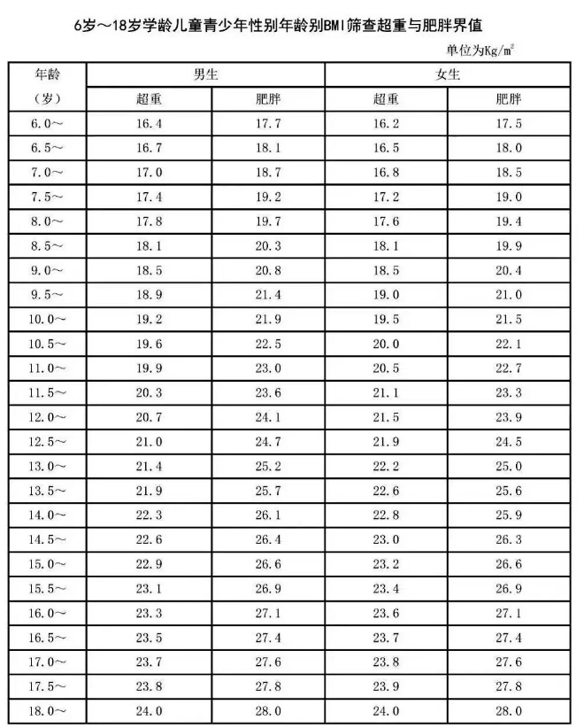 計(jì)算出BMI值后,對(duì)照界值表查看肥胖情況:
