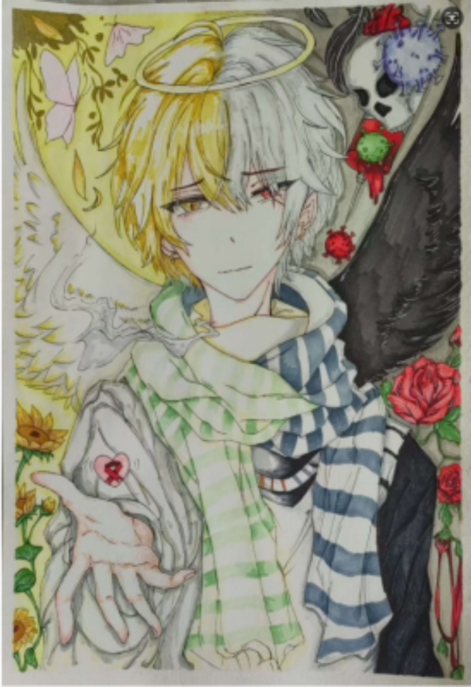 作者:高思羽(左邊以天使代表著健康與光明,右邊以灰暗色勾勒艾滋的危害,強調(diào)預(yù)防艾滋的重要性)