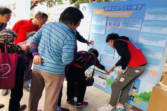 本次系列主題宣傳活動(dòng)先后在沙頭角街道憲法公園、鹽田街道辦對(duì)面廣場(chǎng)、梅沙街道文化站廣場(chǎng)舉行。活動(dòng)期間,現(xiàn)場(chǎng)設(shè)置了大型展板、易拉寶,并通過派發(fā)宣傳單張等形式,宣傳介紹了鹽田區(qū)打造雙典范城區(qū)的相關(guān)內(nèi)容及取得的成果?,F(xiàn)場(chǎng)還有知識(shí)問答、趣味拼字、創(chuàng)意拍照等有獎(jiǎng)互動(dòng)活動(dòng),讓居民在良好互動(dòng)中進(jìn)一步了解鹽田區(qū)打造雙典范城區(qū)活動(dòng)。
