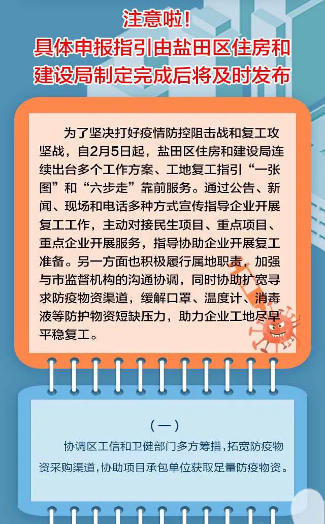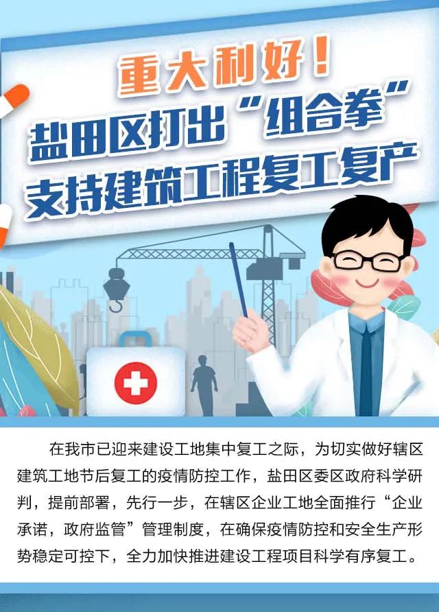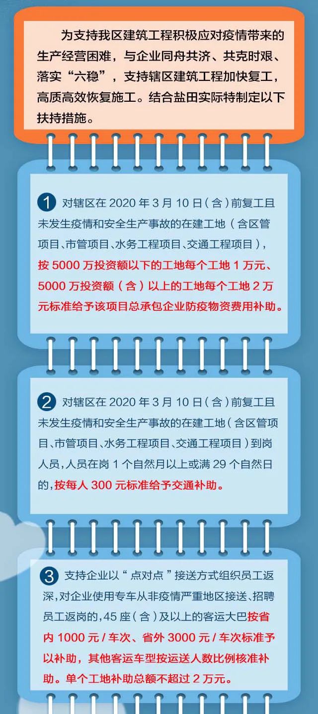 發(fā)放防疫物資補(bǔ)助、支持使用專車接送員工返崗、給予工地到崗人員交通補(bǔ)助……為切實(shí)做好建筑工地的疫情防控工作,全力加快推進(jìn)建設(shè)工程項(xiàng)目科學(xué)有序復(fù)工,鹽田區(qū)結(jié)合實(shí)際,制定出臺(tái)若干扶持措施,拿出“真金白銀”,支持轄區(qū)建筑工程積極應(yīng)對(duì)疫情帶來(lái)的生產(chǎn)經(jīng)營(yíng)困難,有序復(fù)工復(fù)產(chǎn),與企業(yè)同舟共濟(jì)、共克時(shí)艱。