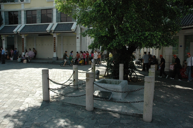 在進入中英街后街邊的這口古井,該井為清代康熙年間遷來沙頭角拓荒的客家人所建,已有三百多年的歷史,是當?shù)厝藗冿嬘玫乃?,直到現(xiàn)在中英街兩邊的人們中還流傳著"同走一條街,共飲一井水"的民謠。"飲水思源",古井對當?shù)鼐用裼兄B(yǎng)育之恩,也牽連著居住在中英街兩邊居民的鄉(xiāng)情和親情。它不僅是沙頭角歷史發(fā)展的見證,也是中英街形成和發(fā)展的歷史見證。