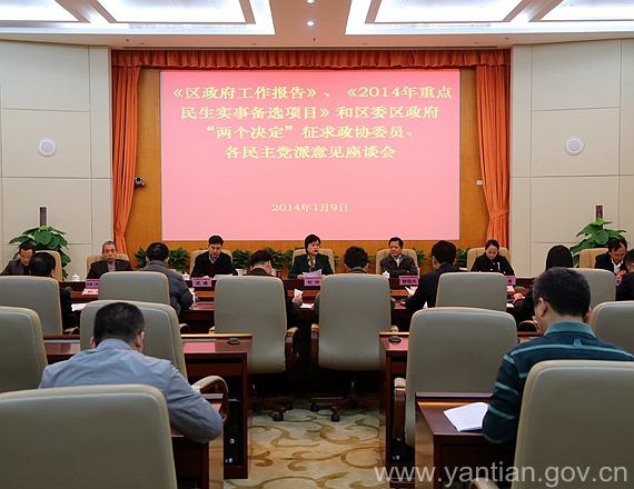 《區(qū)政府工作報(bào)告》、《2014年重點(diǎn)民生實(shí)事備選項(xiàng)目》和區(qū)委、區(qū)政府“兩個(gè)決定”征求政協(xié)委員、各民主黨派意見(jiàn)座談會(huì)(2014年1月9日)