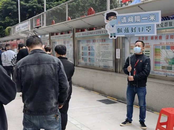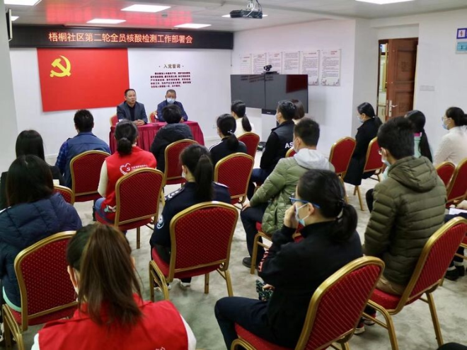接到大規(guī)模核酸檢測任務(wù)后,海山街道掛點領(lǐng)導(dǎo)到梧桐社區(qū)召開工作部署會議,及時傳達(dá)疫情防控會議精神,明確職責(zé)分工,快速統(tǒng)籌推進(jìn)大規(guī)模核酸檢測工作。根據(jù)社區(qū)實際情況當(dāng)晚立即布置兩個檢測點,并細(xì)化人員分流安排;通過居民微信群、小喇叭、打電話、網(wǎng)格員掃樓逐戶通知等方式,發(fā)動社區(qū)居民進(jìn)行核酸檢測,確保達(dá)到 “應(yīng)檢盡檢”。