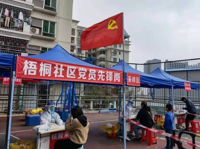 梧桐社區(qū)黨委充分發(fā)揮黨建引領(lǐng)作用,以黨員帶動群眾,充分發(fā)揮基層黨組織戰(zhàn)斗堡壘和黨員先鋒模范作用。黨員、工作人員、群眾志愿者、基干民兵、退役軍人組成一支志愿服務(wù)隊伍奔赴核酸檢測一線。踐行為人民服務(wù)的宗旨,用實際行動彰顯共產(chǎn)黨員的初心和擔(dān)當(dāng)。黨員群眾同心,共治共建美好家園。