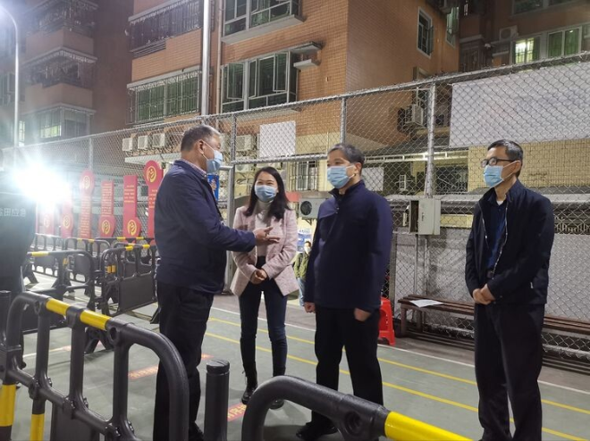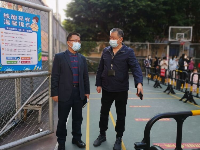 區(qū)委常委,區(qū)政府副區(qū)長、黨組成員,海山街道黨工委書記曾堅朋到梧桐社區(qū)核酸檢測的采樣點檢查指導(dǎo)工作