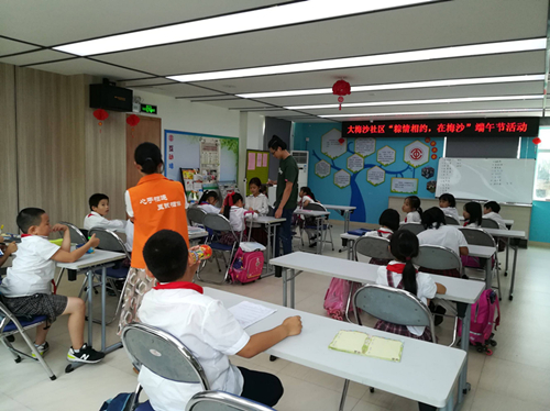 活動(dòng)的開始階段,社工介紹了端午節(jié)的由來,以及屈原的生平事跡,并號(hào)召小朋友們向屈原學(xué)習(xí)愛國(guó)精神。為了檢驗(yàn)小朋友的吸收效果,社工及時(shí)地根據(jù)講授的知識(shí)出了一些趣味問答。小朋友們爭(zhēng)先恐后地回答,都想為自己多加一分,成為最后的獲勝者。在社工的引導(dǎo)下,小朋友們分享了他們?cè)诖竺飞成鐓^(qū)居住期間過端午節(jié)的方式,以及遇到的有趣的人和事。