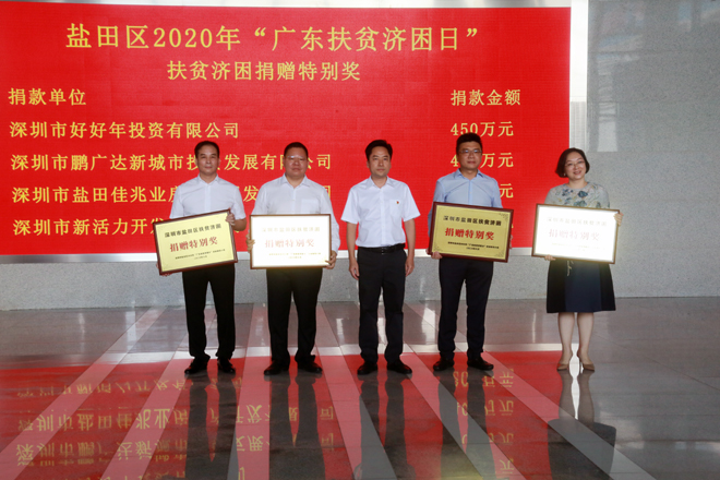 捐贈(zèng)活動(dòng)現(xiàn)場(chǎng),為褒揚(yáng)捐贈(zèng)者的愛心義舉,弘揚(yáng)大愛精神,鹽田區(qū)對(duì)在今年“廣東扶貧濟(jì)困日”活動(dòng)期間捐款的愛心企業(yè)和愛心人士頒獎(jiǎng)。深圳市好好年投資有限公司、深圳市鵬廣達(dá)新城市投資發(fā)展有限公司、深圳市鹽田佳兆業(yè)房地產(chǎn)開發(fā)有限公司、深圳市新活力開發(fā)有限公司被授予鹽田區(qū)2020年“廣東扶貧濟(jì)困日”捐贈(zèng)特別獎(jiǎng),深圳市合正房地產(chǎn)集團(tuán)有限公司、深圳市大梅沙房地產(chǎn)開發(fā)有限公司被授予鹽田區(qū)2020年“廣東扶貧濟(jì)困日”愛心企業(yè)金獎(jiǎng)。