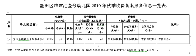 根據(jù)深圳市發(fā)改委、教育局和財(cái)政委文件(深發(fā)改〔2012〕574號(hào))轉(zhuǎn)發(fā)《廣東省物價(jià)局、教育廳和財(cái)政廳關(guān)于〈幼兒園收費(fèi)管理暫行辦法〉的實(shí)施細(xì)則》和《廣東省物價(jià)局、教育廳、財(cái)政廳關(guān)于〈民辦幼兒園收費(fèi)備案的實(shí)施細(xì)則〉的通知》(粵價(jià)〔2012〕47號(hào))、《深圳市民辦幼兒園收費(fèi)備案指引》(深發(fā)改〔2019〕243號(hào))等有關(guān)規(guī)定和要求,經(jīng)幼兒園申請(qǐng)并提交《收費(fèi)備案表》,區(qū)教育局、區(qū)發(fā)改局受理了鹽田區(qū)維君匯壹號(hào)幼兒園的備案,現(xiàn)將有關(guān)收費(fèi)備案信息予以公示(具體信息見附件)。